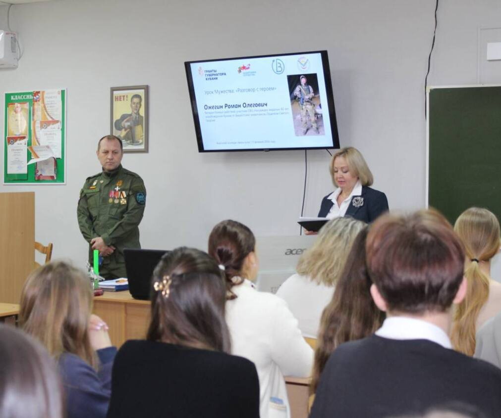В Анапском колледже сферы услуг прошел урок мужества. Со студентами встретились специалисты Центра «Вектор» и участник СВО Роман Ожегин, награжденный знаком отличия ордена Святого Георгия – Георгиевским Крестом IV степени. Мероприятие прошло в рамках проекта «Служба сопровождения участников специальной военной операции в Анапе «Мост в мирную жизнь», с использованием гранта Губернатора Кубани при поддержке Фонда «Защитники Отечества». Диалог получился по-настоящему живым и глубоким. Студенты спрашивали не только о службе, но и о том, как отнеслись дома к решению пойти на СВО, какие были мечты во время службы, какие мысли согревали во время боя, как развить в себе жизненную стойкость, умение справляться со страхами и неуверенностью, насколько важно оставаться человеком на войне и что для бойцов значат простые вещи — письма от детей и тепло окопной свечи. Такие встречи позволяют молодому поколению не понаслышке узнать о подвиге современников и вдохновиться их примером.