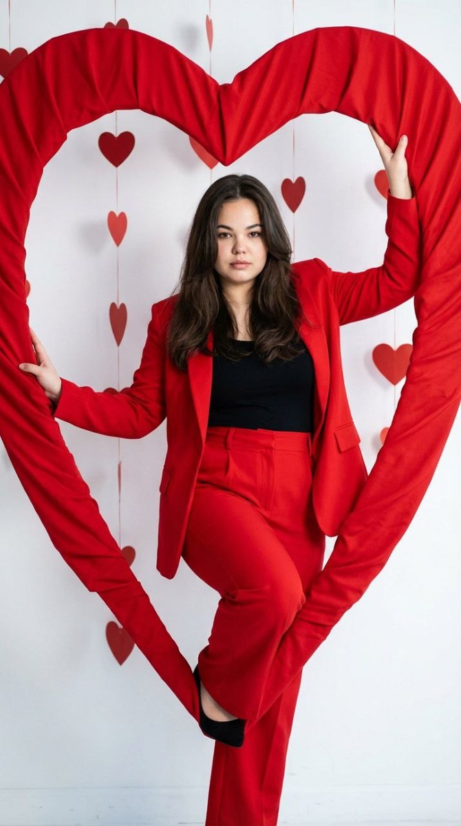 😀Выбираем "нейросети" 😀Нажимаем "Nano Banana" 😀Нажимаем "Nano Banana Pro" 😀Прикрепляем через скрепку свое фото и выбранный промпт 😀Наслаждаемся результатом😍 Точное сохранение черт лица, естественные пропорции, без искажений анатомии, без изменения внешности, фотореализм. Фэшн-портрет стильной женщины, позирующей внутри большой декоративной рамки в форме сердца, выполненной из драпированной красной ткани. На фоне — минималистичная белая стена с подвешенными красными сердцами на тонких нитях, создающими эффект художественной инсталляции. Она одета в ярко-красный костюм: пиджак и брюки с высокой талией, под которым чёрный топ, создающий современный, уверенный fashion-образ. Её волосы длинные уложены в стиле олд мани, макияж чистый и выразительный: ровный тон кожи, подчёркнутые глаза, аккуратные брови и натуральные нюдовые губы. Она смотрит прямо в камеру с уверенным, модельным взглядом. Поза динамичная — одна нога опирается на край сердца, руки держат рамку, создавая эффект движени