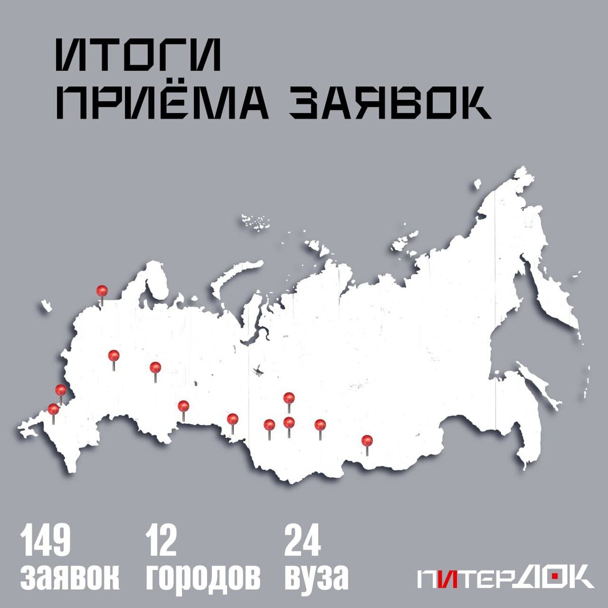 ». На карту России 🇷🇺 мы нанесли города и вузы нашей страны, которые откликнулись и решили принять участие. В топ-3 по количеству отправленных фильмов вошли: ГИКИТ (64), ВГИК с филиалами в Иркутске и Ростове-на-Дону (26), ГИТР (24). «ПитерДок» пройдет в Петербурге с 7 по 11 апреля этого года при поддержке ГИКИТ, Президентского фонда культурных инициатив и Росмолодёжь.Гранты #фондкультурныхинициатив #грантдлякреативныхкоманд #ПитерДОК2026 #Росмолодёжь #РосмолодёжьГранты
