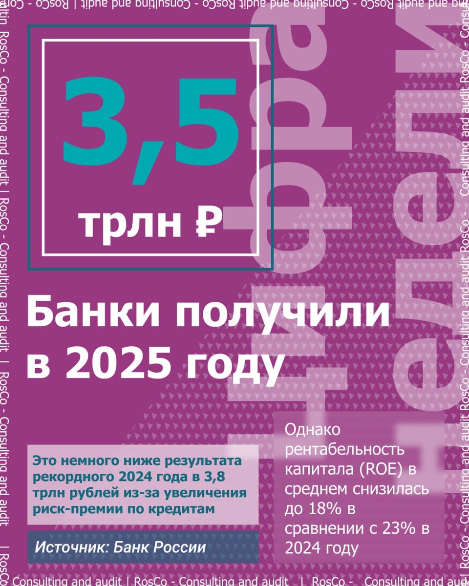 Это немного ниже результата рекордного 2024 года в 3,8 трлн рублей из-за увеличения риск-премии по кредитам. ❗️Однако рентабельность капитала (ROE) в среднем снизилась до 18% в сравнении с 23% в 2024 году. В 2024 г. банки «прыгнули выше головы», активно расходуя капитал, а в 2025 г. рост прибыли был «по средствам», прокомментировал данные директор департамента банковского регулирования и аналитики ЦБ Александр Данилов. 💼 RosCo в Telegram и Max