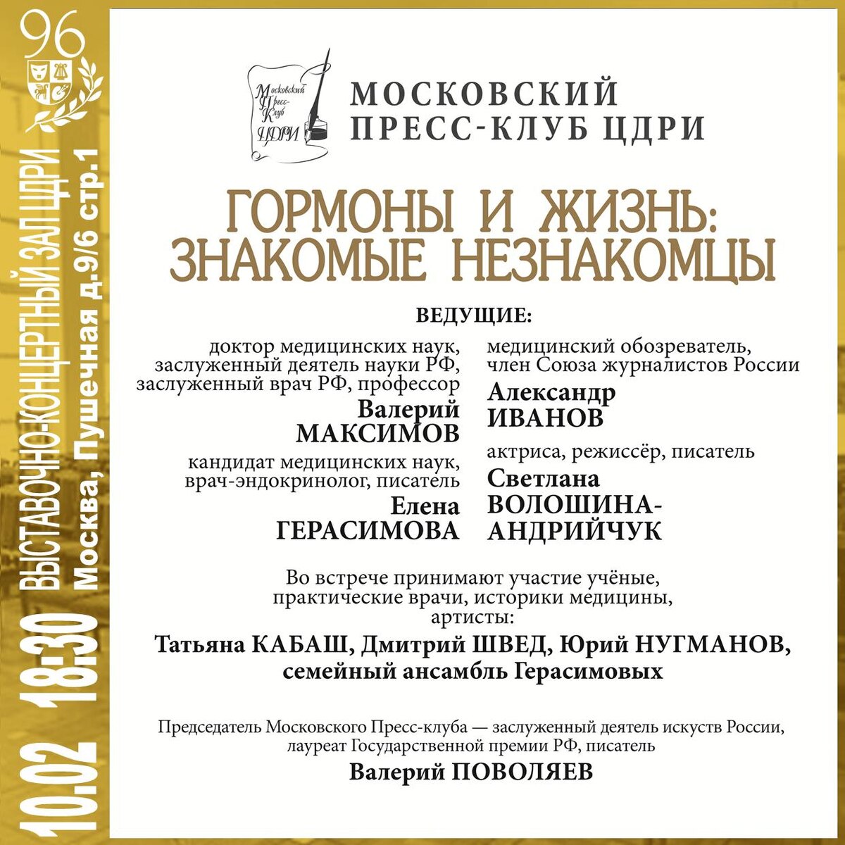 Московский Пресс-клуб ЦДРИ Ведущие: Валерий Максимов — доктор медицинских наук, заслуженный деятель науки РФ, Заслуженный врач РФ, профессор Елена Герасимова — кандидат медицинских наук, врач-эндокринолог, писатель Александр Иванов — медицинский обозреватель, член Союза журналистов России Светлана Волошина-Андрийчук — актриса, режиссёр, писатель Во встрече принимают участие учёные, практические врачи, историки медицины, артисты: Татьяна Кабаш, Дмитрий Швед, Юрий Нугманов, семейный ансамбль Герасимовых Председатель Московского Пресс-клуба — заслуженный деятель искусств России, лауреат Государственной премии РФ, писатель — Валерий Поволяев