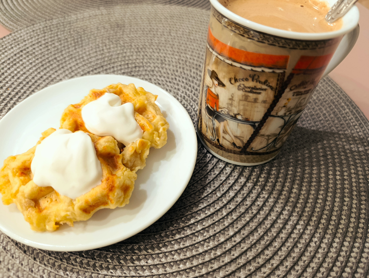 Третий день эксперимента. На завтрак были картофельные вафли со сметаной (из остатков пюре) . Просто добавила в него одно яйцо, соль, сахар и муку. Количество её брала на глаз, постепенно доводя массу до густой консистенции