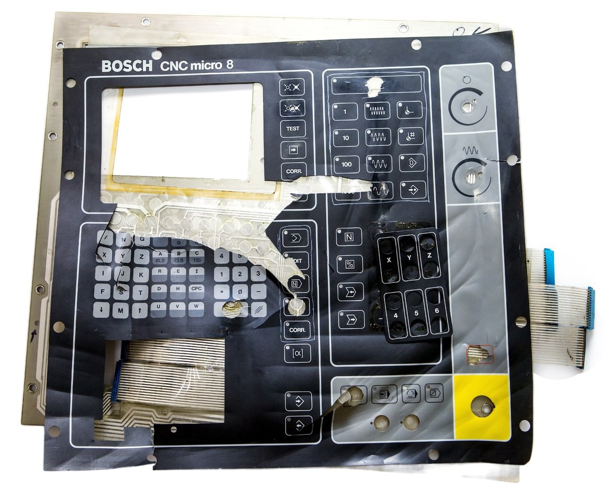 ⭐️ Один из таких проектов – точный аналог клавиатуры Bosch CNC Micro 8 для станков с ЧПУ. Заказчик принес изношенный образец – мы создали версию с сохранением всех функций и улучшенными характеристиками. 📷 На фото их до [изношенная клавиатура с поврежденными дорожками и протертыми кнопками] VS наше после [клавиатура на металлическом основании с кнопками и просветами из материалов повышенной прочности] ⬇️