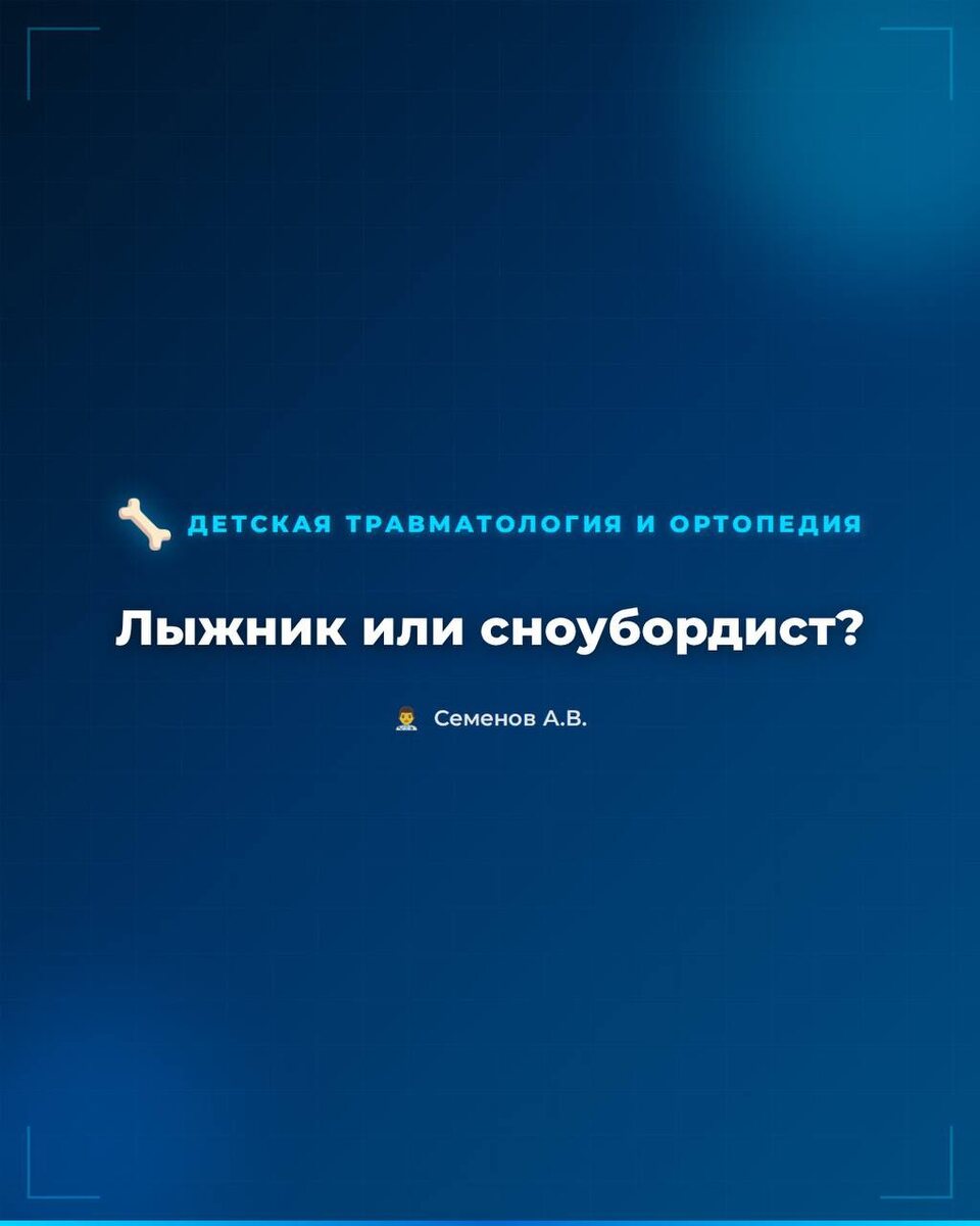 ? #спортивная_травма 👋 Привет, друзья! На связи Андрей Семенов. 👨⚕️ 🔜 Спор «лыжник или сноубордист» выходит за рамки простого удовольствия - сегодня разберем РАЗНУЮ МЕХАНИКУ травм у лыжников и сноубордистов! 📊 По данным крупных эпидемиологических исследований, общий риск травмы сопоставим, но распределение по телу принципиально разное. ⚡️ У лыжников до 40–45% повреждений приходится на нижние конечности, у сноубордистов до 50% — на верхние. 🔜 Ключ к пониманию — биомеханика фиксации и векторы силы при падении. 🟡 Горнолыжник стоит на двух независимых «рычагах» — лыжах. ✏️ При срыве одна нога может тормозить, другая — продолжать движение, создавая мощный ротационный момент. ⚠️ Эта энергия уходит прямиком в коленный сустав. 🦴 Самая частая серьезная травма — разрыв передней крестообразной связки (ПКС). ✏️ Классический механизм — «phantom foot»: падение назад, согнутое колено и разворот туловища. 📊 На ПКС приходится до 25–30% тяжелых травм лыжников, у женщин риск выше в 3–5 р