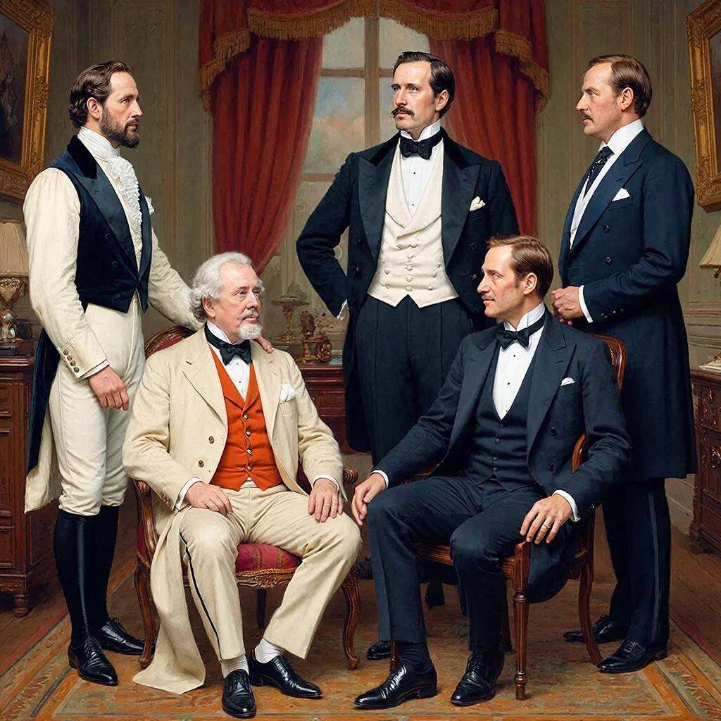 Следующим английским монархом, который был по стилю, стал принц Уэльский Эдуард, потом коронованный с порядковым номером Седьмой. Жил он во второй половине 19 века и даже захватил 10 лет века двадцатого. И был он принц-ждун, потому что ну очень долго ждал корону от маменьки-долгожительницы Виктории. Дольше его прождал корону вот совсем недавно нынешний король Карл III, но о нем позже. Так вот Эдуард VII, маясь в ожидании трона, много чего понапридумывал в одежде, довольно полезного и интересного, от манжетов на брюках и расстегнутой нижней пуговицы на жилете (толстый был) до узла виндзор на галстуке. А еще при нем возникла и расцвела пышно улица Севил Роу в Лондоне, которая и по сей день символизирует классическую безупречность в одежде джентльмена.