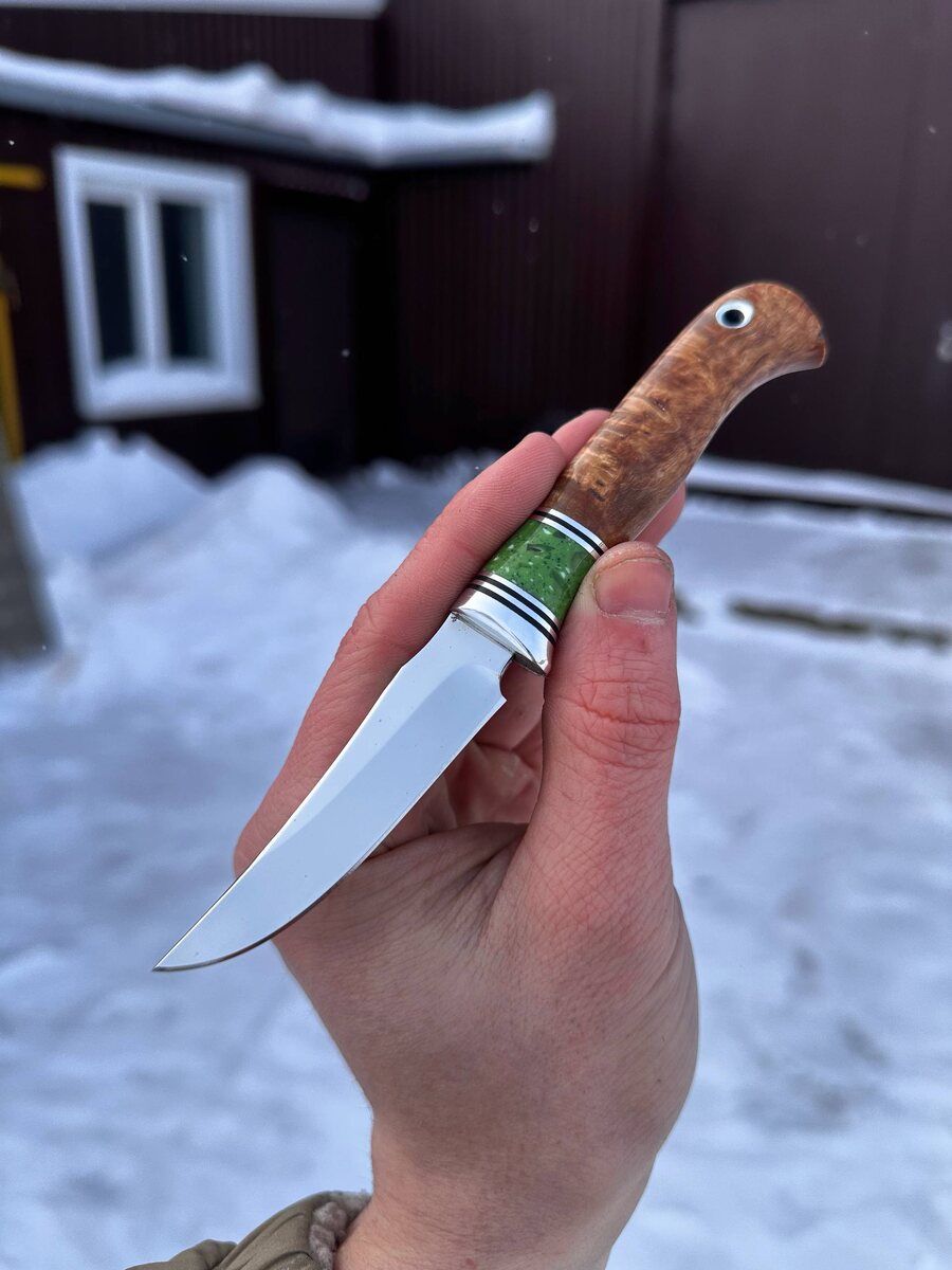 ! *Встречайте всеми любимый нож "Малыш" — компактный, удобный, с настоящим рабочим характером!* Что делает "Малыш" особенным? - 🔥 *Кованая сталь Х12МФ* (твёрдость 61-62 HRC) — отлично держит заточку, устойчива к нагрузкам и коррозии. - 🌳 *Рукоять из акрила зеленого и карельской березы янтарь— не только красиво, но и удобно лежит в руке даже в сырую погоду. - 🧳 *Ножны из натуральной кожи* — надёжное хранение и быстрый доступ. - 👍 *Пожизненная гарантия* на отсутствие производственных дефектов. Для кого: Идеально подойдёт для охотников, рыбаков, туристов, грибников и просто ценителей ручной работы. Цена со скидкой — 7 573 руб. _Обычная цена — 8 910 руб._ 💬 Заказать просто: ✉️ Пишите в @Nazarklinokbot 📞 или звоните/пишите в WhatsApp: +7 910 134-38-31 #ручнаяработа #ножМалыш #КузницаНазарова #тихаяохота #охотничьийнож #ручнойнож