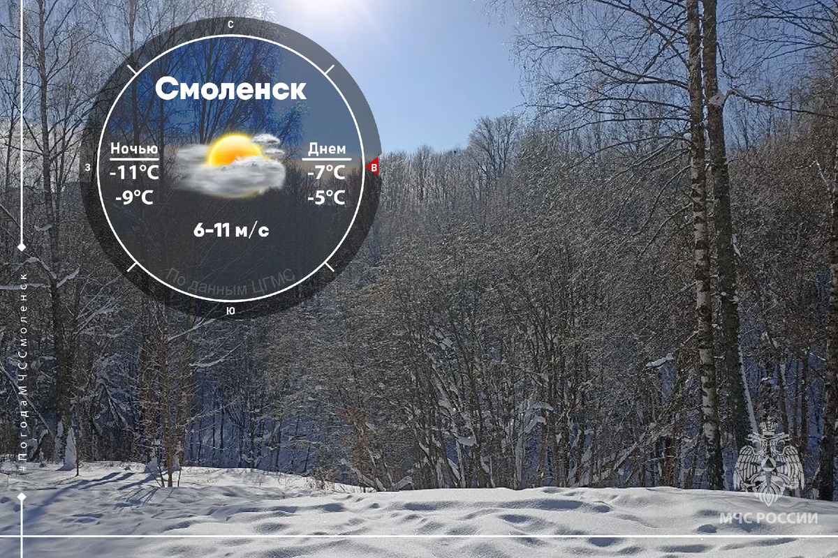 - в Смоленске: ночью -11°С …-9°С, днём -7°С …-5°С. Обо всех изменениях в погоде смотри на сайте meteoinfo.ru/hdmapsmete.... МЧС России настоятельно рекомендует соблюдать повышенные меры пожарной безопасности. Использование альтернативных источников обогрева может привести к возникновению пожара, если не соблюдать простые правила:
