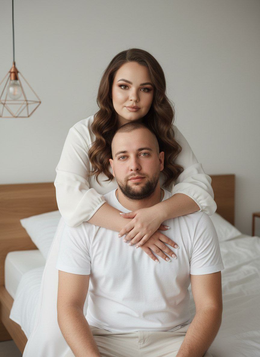 😀Выбираем "нейросети" 😀Нажимаем "Nano Banana" 😀Нажимаем "Nano Banana Pro" 😀Прикрепляем через скрепку свое фото и выбранный промпт 😀Наслаждаемся результатом😍 Создай фото, не меняя черты лица и цвет волос. У девушки безупречный макияж. Волосы каштанового цвета длинные распущенные. Интимный кадр в минималистичной спальне: мужчина в белой футболке и бежевых брюках сидит на краю кровати, женщина с длинными коричневыми волосами и белым длинным топом обнимает его сзади; мягкий естественный свет, подвесной светильник в верхнем левом углу, нейтральная палитра, неглубокая глубина резкости, акцент на руках, аккуратном французском маникюре и серебряной цепочке. #парные@annapromtii20