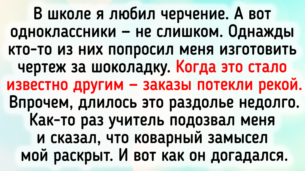 В школе я любил черчение. А вот одноклассники — не слишком. Однажды кто-то из них попросил меня изготовить чертеж за шоколадку. Когда это стало известно другим — заказы потекли рекой. Впрочем, длилось это раздолье недолго. Как-то раз учитель подозвал меня и сказал, что коварный замысел мой раскрыт. И вот как он догадался: выдали меня бумага, стиль работы и резкий рост успеваемости окружающих. Мне было рекомендовано сворачивать «конструкторское бюро». Вот так и закончилась моя школьная предпринимательская деятельность. К слову, учитель оказался человеком понимающим, не наказал и даже поставил мне лишнюю пятерку за усердие. © Pilnaman / Pikabu