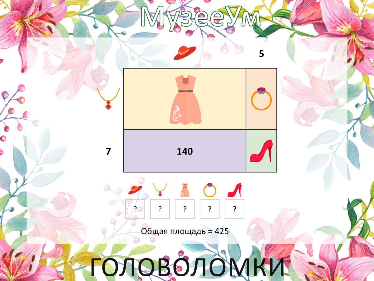 💃 Женская логика непредсказуема и удивительна, согласны? Именно поэтому нам захотелось создать особую головоломку для наших очаровательных подписчиц! ❓ Решите головоломку: какие числа должны стоять вместо рисунков? 🔗 Больше интересных женских головоломок в библиотеке МузееУм: