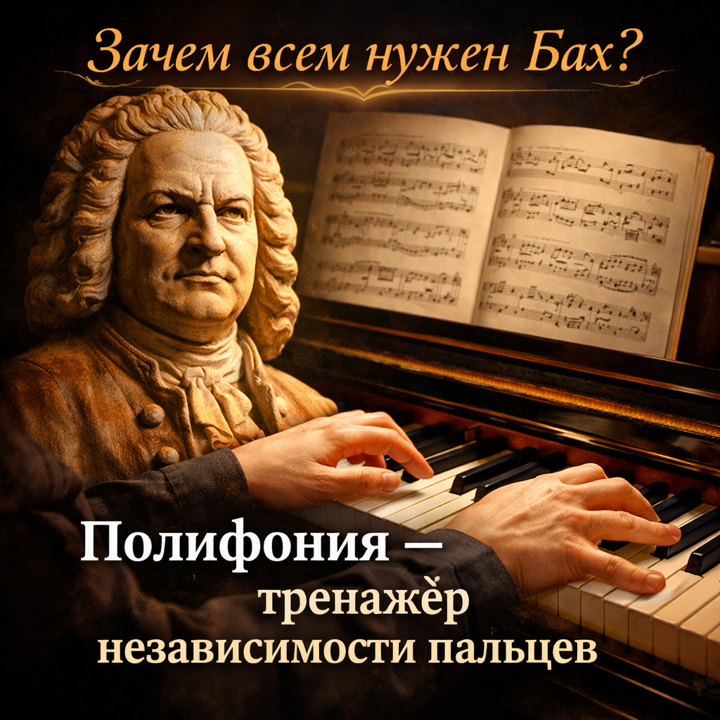 Парадокс в том, что независимость пальцев — не про пальцы. Это про то, насколько вы умеете вести две музыкальные мысли одновременно. И здесь Бах — не «раздел репертуара», а система воспитания пианиста: слух, внимание, координация, фраза, артикуляция — всё собирается в один механизм.