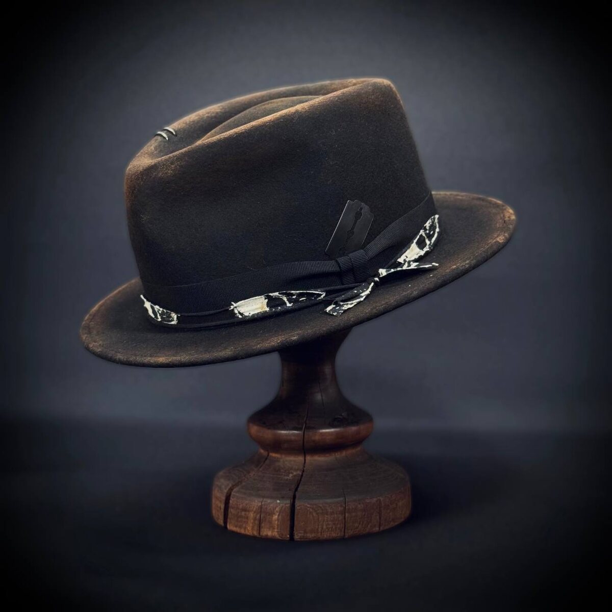 Дерзкие детали в лаконичной форме Классическая трилби в чёрном цвете с интенсивным обжигом для состаренного характера. Низкая тулья, небольшие поля. Отделка — репсовая лента и хлопковая повязка со светлыми, разлохмаченными кусочками ткани, завязанная сбоку. Акцент, завершающий образ — чёрная бритва. ————————— Ответим на ваши вопросы:)