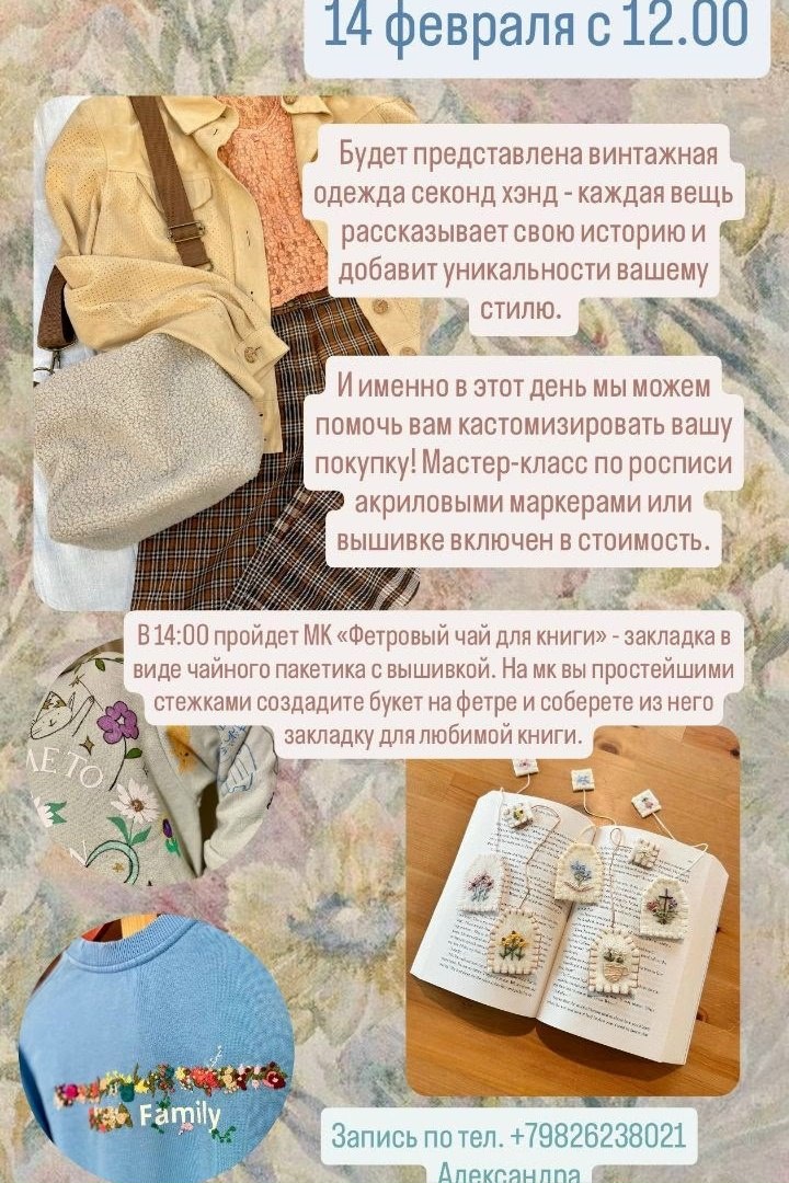 ) 14 февраля с 12.00 ждем вас на уникальное мероприятие!!! Товары, которые вас ждут: • Дизайнерские товары для дома — картины, лампы, вазы, декор. Папье маше, керамика и текстиль - предметы для уюта и красоты повседневной жизни. У нас вы найдёте уникальные вещи, которые сделают ваш дом более стильным и комфортным. • Косметички ручной работы — удобные, тактильные, сшитые в небольшом количестве и с вниманием к деталям. Идеальный аксессуар для хранения ваших косметических средств или мелочей. • Также у нас будет представлена винтажная одежда секонд хэнд - каждая вещь рассказывает свою историю и добавит уникальности вашему стилю. И именно в этот день мы можем помочь вам кастомизировать вашу покупку! Мастер-класс по росписи акриловыми маркерами или вышивке включен в стоимость. В 14:00 также пройдет МК «Фетровый чай для книги» - закладка в виде чайного пакетика с вышивкой. На мк вы простейшими стежками создадите букет на... Перейти на оригинальный пост