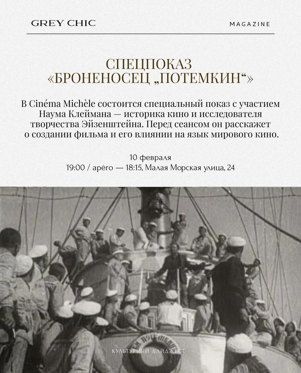 🔖Спецпоказ «Броненосца „Потёмкин“» и встреча с Наумом Клейманом С 29 января в прокат возвращается культовый фильм Сергея Эйзенштейна — к 100-летию картины. 10 февраля в Cinéma Michèle состоится специальный показ с участием Наума Клеймана — историка кино и исследователя творчества Эйзенштейна. Перед сеансом он расскажет о создании фильма и его влиянии на язык мирового кино. 📍Cinéma Michèle, Малая Морская улица, 24, 🟢10 февраля, 19:00 / apéro — 18:15 Билеты 🔖Фестиваль ко Дню рождения Анны Павловой С 13 февраля по 22 марта в Arts Square Gallery пройдет Третий фестиваль, приуроченный ко дню рождения великой балерины. Тема этого года — «à la russe»: исследование русского стиля и его современных прочтений. В программе — выставки, перформансы, лекции и музыкальные вечера, объединяющие балет, изобразительное искусство и моду. 📍Arts Square Gallery и Arts Square Bar, Итальянская ул., 5 🟢ежедневно 12:00–21:00 Подробности 🔖Премьеры в кинотеатре «Аврора» 12 февраля — премьера фильма С