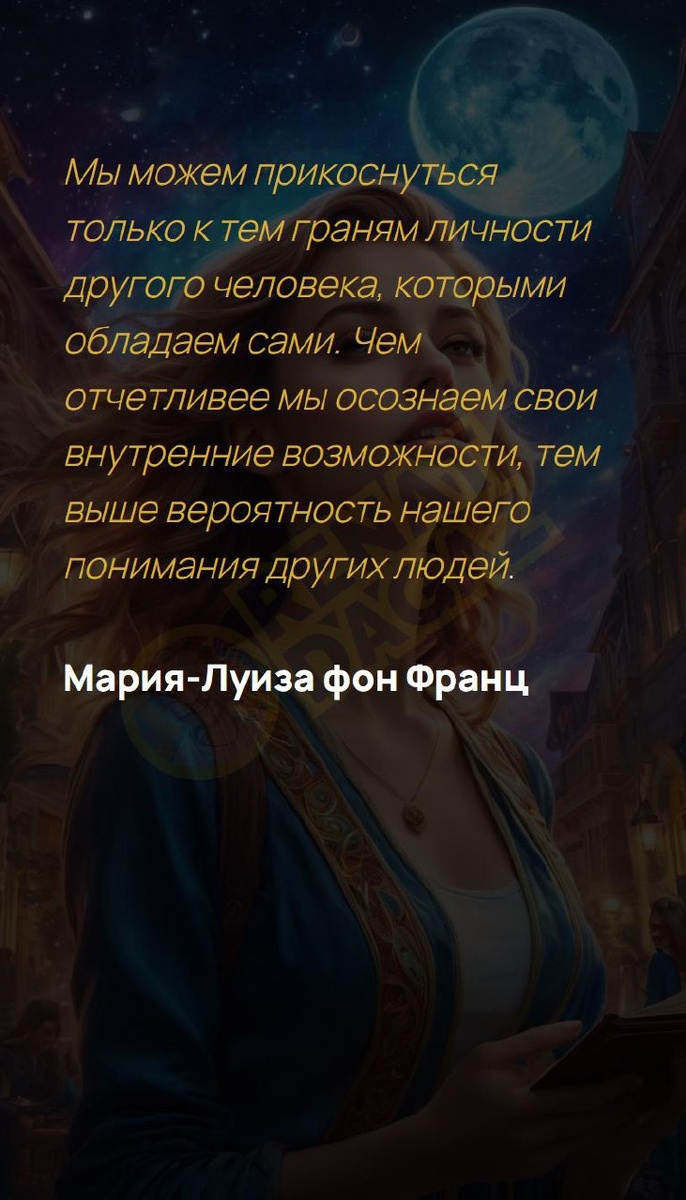 Мы можем прикоснуться только к тем граням личности другого человека, которыми обладаем сами. Чем отчетливее мы осознаем свои внутренние возможности, тем выше вероятность нашего понимания других людей. Мария-Луиза фон Франц Архитектура вашей души | Матрица судьбы T | VK | Pin | YouTub | Dzen #гармониясвнешниммиром #принятие #осознанноебытие #гармония #живисейчас #путьксебе #внутренниймир #здоровьедуши #философияжизни #6число #6февраля