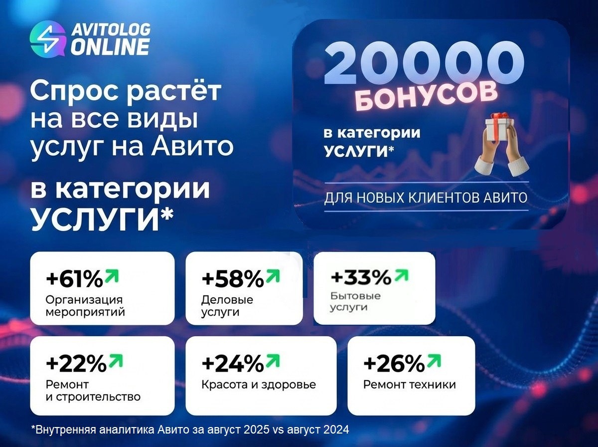 ! Делимся интересными данными от аналитиков Авито про «Услуги» на сайте Avito.ru: Спрос на все виды услуг растет минимум на 22% год к году 🚀 Это отличный повод начать размещаться на площадке профессионально! Кстати, напоминаем, что новым клиентам в Услугах мы начисляем бонусы на сумму 20 000 рублей на авито кошелек. 🎁 Хотите узнать подробнее? Пишите нам → @Andrei_avitolog avitologonline.ru