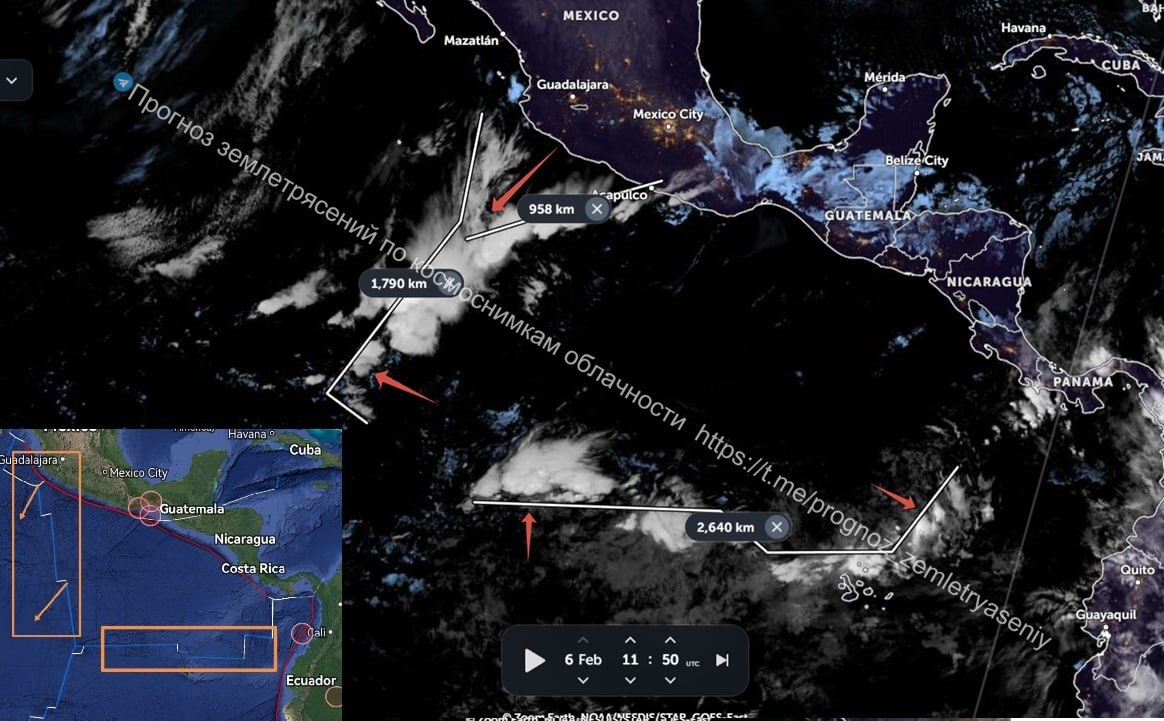 В зоне Центральной Америки сегодня продолжает фиксироваться сильное тектоническое напряжение на обрамлении плиты Кокос. Наибольшее беспокойство вызывает зона на севере плиты в районе Мексики, где наблюдается ОСТИ уровня М7+. Север плиты Кокос начал вызывать беспокойство еще 28 января. ====== Today, strong tectonic stress continues to be recorded in the Central American zone on the Cocos plate rim. The area of greatest concern is in the north of the Cocos plate in the region of Mexico, where there is a CSTI of the M7+ level. The north of the Cocos plate began to cause concern on January 28.