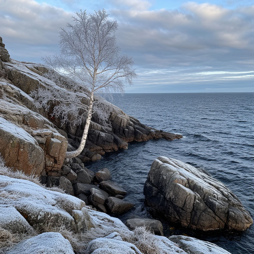 Промт: "Создать картинку- север, море, скала, на скале много камней и среди камней стоит одна маленькая березка"
