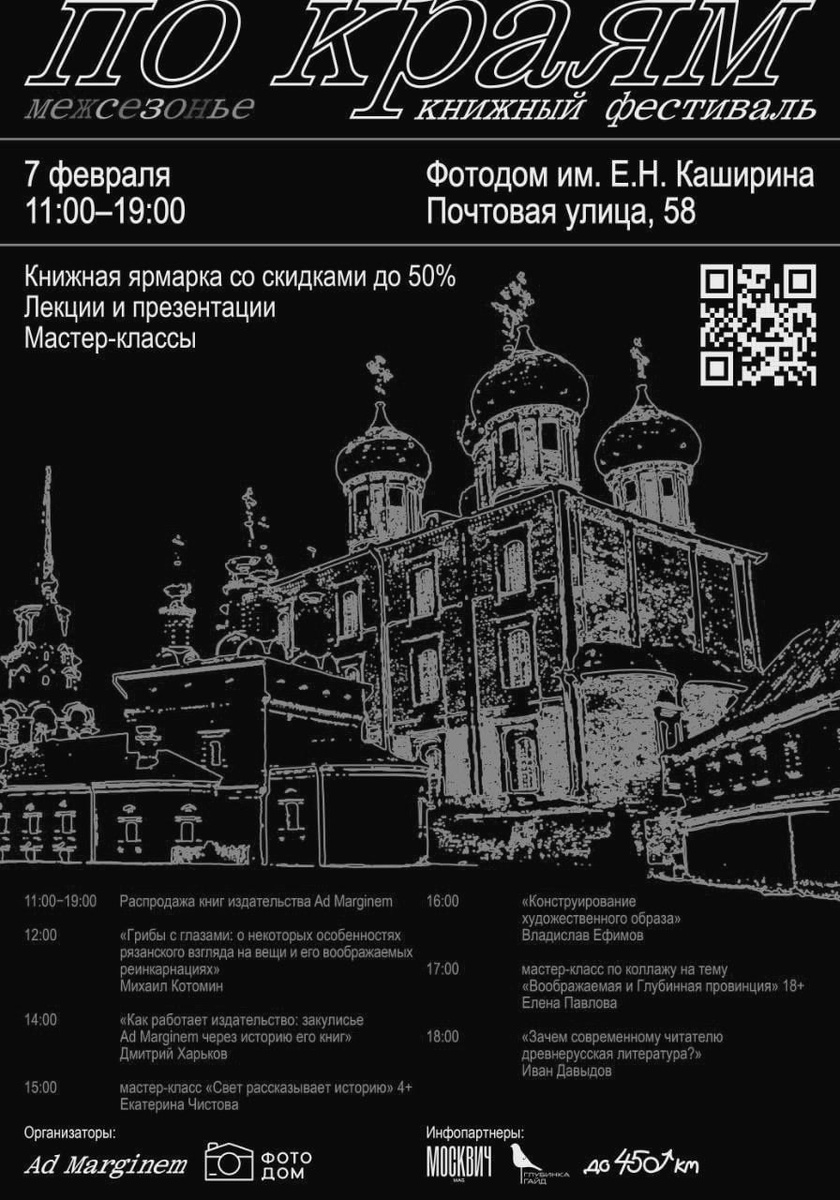 ». Мы тоже расскажем, что приготовило издательство Ad Marginem. Когда: 7 февраля, уже в эту субботу! Где: улица Почтовая, 58 Что будет: фестиваль «По краям»! 🚩С 11 до 19 часов — большая распродажа со скидками до 50%. Издательство привезет более 1500 книг о философии, науке, искусстве, современной культуре, а также художественную и детскую иллюстрированную литературу. Лекции ⚪️ в 12 часов — «Грибы с глазами: о некоторых особенностях рязанского взгляда на вещи и его воображаемых реинкарнациях», издатель Михаил Котомин в 14 часов — «Как работает издательство: закулисье Ad Marginem через историю его книг», pr-директор Дмитрий Харьков в 16 часов — «Конструирование художественного образа», фотограф и художник Владислав Ефимов в 18 часов — «Зачем современному читателю древнерусская литература?», автор книги «Люди и города» Иван Давыдов За подробностями — на сайт. Пропускать событие не хотим! А вы? #гуляка_фестиваль 🤩 Рязанский гуляка 🇷🇺 Рязанский гуляка