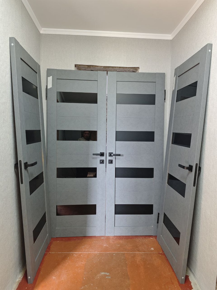 В процессе монтажа межкомнатные двери в цвете темный бетон,с черным стеклом 😍
