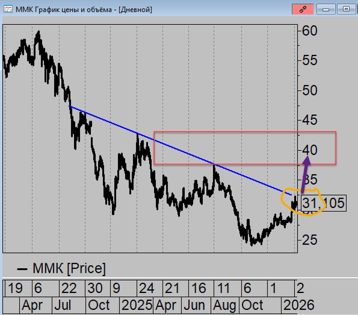 Если в ВТБ есть крупный покупатель и мы даже знаем кто это (хотя публично и не скажем 😂) То в ММК тоже есть очень крупный покупатель. И почему его покупают станет ясно чуть позднее. Но сейчас о технике. Почему не продаю конкретно эту бумажку, хотя как вам уже писал уровень 2840 у нас был предсказан по индексу заранее, а в предыдущих постах в канале вам объяснялось что после достройки паттерна в этом месте часто бывает откат или "боковичёк". Именно это в бумаге и происходит. ☝️Когда я был начинающим трейдером, очень много прибыли упустил продавая в этом месте. Дело в том что сколько бы не длился откат или боковичёк потом движение наверх бывает очень резким и сильным. И случается оно всегда неожиданно, так что в этот ушедший поезд запрыгивать будет уже поздно. Минимальные цели роста тут в районе 37 рублей. Это не значит что там должны идти, расти можно хоть до 60. Это просто значит что минимум в этой формации должны вырасти куда-то туда. ☝️Так что почему не продавал в этом месте.