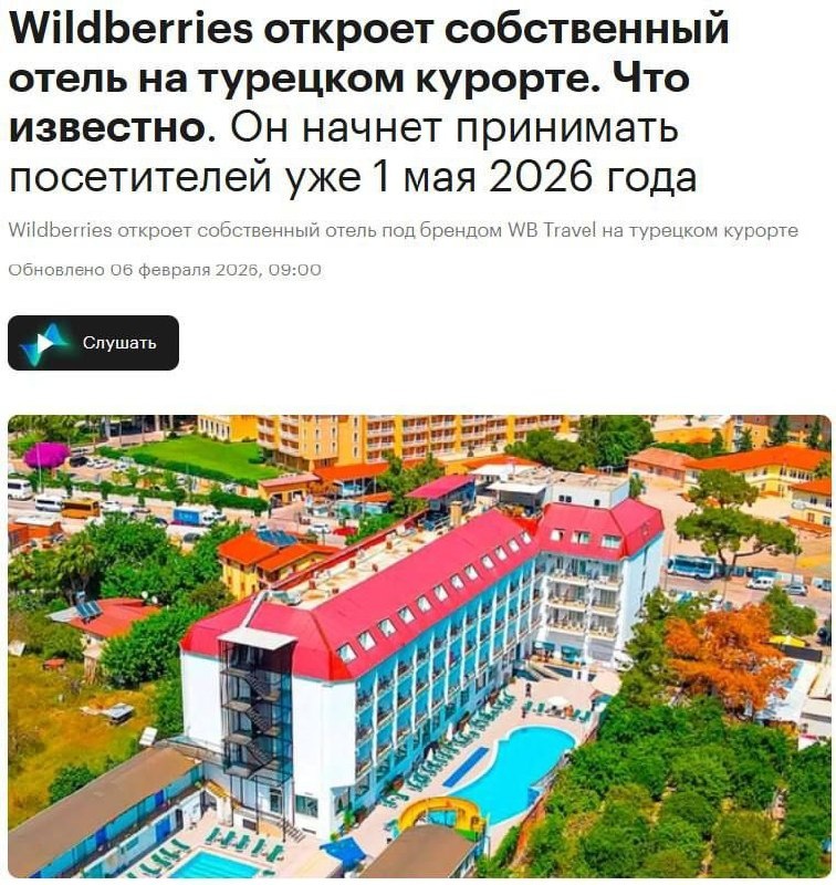 ✈️ Wildberries запускает четырёхзвёздочный отель в Кемере — открытие 1 мая. Всё включено, открытый бассейн и водные горки.