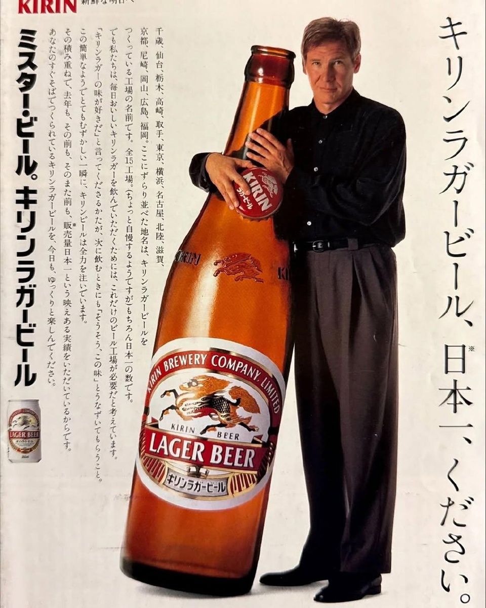 Харрисон Форд в рекламе японского пива Kirin. Кстати, именно эта реклама послужила вдохновением для создания Боба Харриса из «Трудностей перевода» 🍺