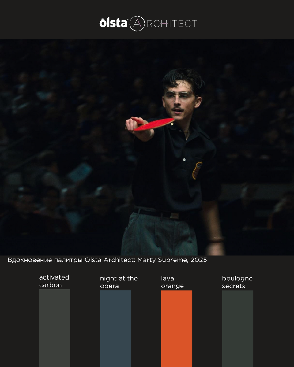 У Marty Supreme есть редкое качество: фильм можно узнать по цвету еще до того, как становится понятно, о чем он. Это следствие продуманной работы с палитрой, в которой один оттенок становится частью кадра, рекламной кампании и общей идентичности проекта. Marty Supreme показывает, как цвет может стать основой визуальной идентичности проекта, не превращаясь в поверхностный эффект. В центре этой системы – оранжевый. В прессе и промоматериалах он закрепился как Marty Supreme Orange – сочный оттенок мандарина, который проходит через постеры, одежду, мерч и наружную рекламу. Harper’s Bazaar отмечает, что в истории фильма этот цвет связан с мячами для настольного тенниса: они лучше читаются в движении, чем белые, и становятся символом амбиций и стремления к видимости. В промо этот мотив превращается в устойчивый визуальный знак. В официальном магазине A24, например, продается елочный шар в виде оранжевого мяча – предмет, который напрямую продолжает эстетику фильма. Рекламная кампания пошла ещ