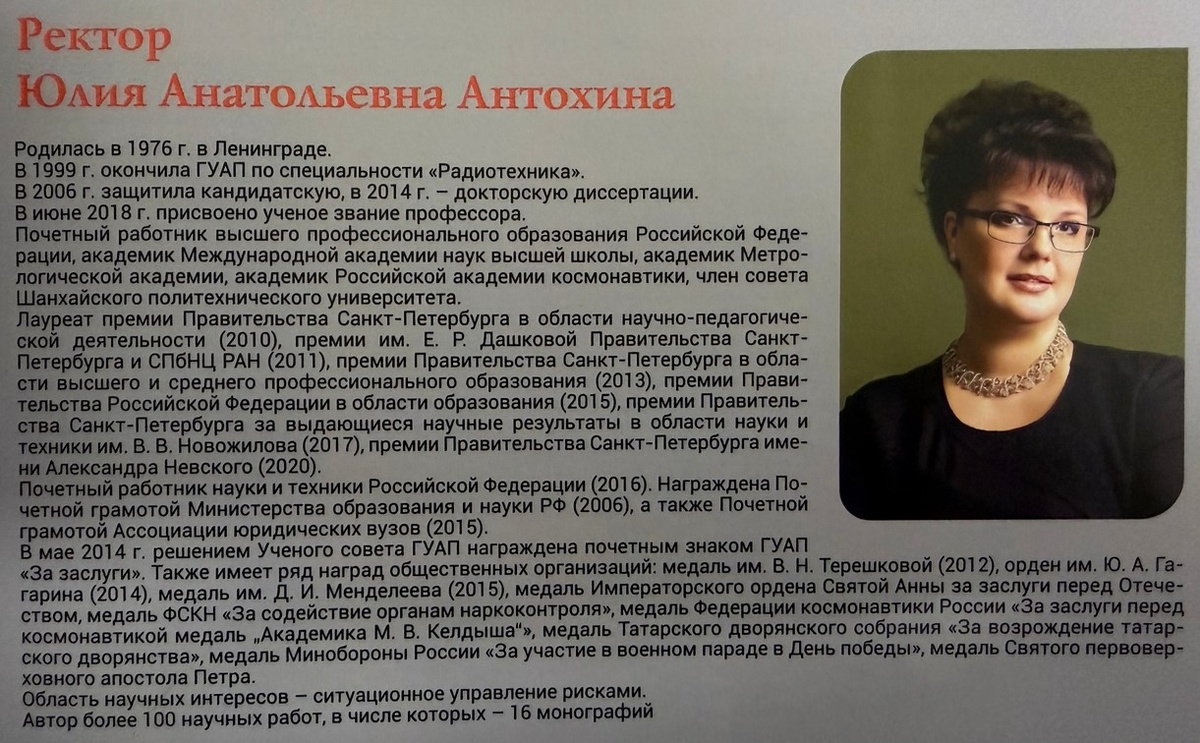 2010-2020 годы стали периодом, когда под руководством нового ректора вуз не просто адаптировался к современным вызовам, а начал сам задавать тренды в инженерном образовании. Вспомним ключевые события этого динамичного десятилетия. 28 ноября 2011 г. Приказом Министерства образования и науки Российской Федерации ГУАП присвоен статус федерального государственного автономного образовательного учреждения высшего профессионального образования. Новая эра – новый ректор Отправной точкой перемен стало 17 июня 2014 года, когда ректором ГУАП была назначена Юлия Анатольевна Антохина. Её путь в университете — идеальная иллюстрация карьерного роста: от студентки радиотехнического факультета и аспирантки до проректора и ректора. Экономист по образованию и стратег по мышлению, Юлия Антаольевна ещё до своего назначения деятельно способствовала внедрению в вузе международных стандартов качества ISO 9001 и системы рейтинговой оценки студентов. Её докторская диссертация 2014 года была посвящена управлению