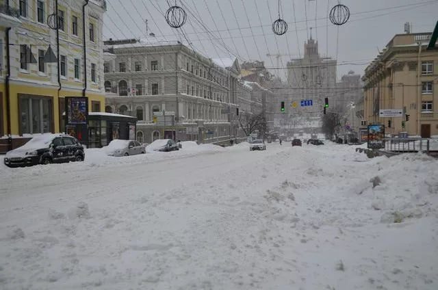 Уборка снега на улицах Киева осложняется большим трафиком авто на дорогах и продолжением снегопада.