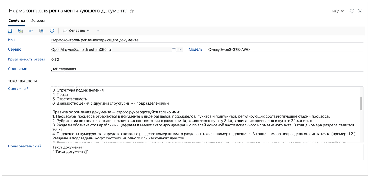 Ранее мы уже писали о том, как большие языковые модели (БЯМ) помогают юристам не утонуть в рутине проверки договоров на соответствие внутренним правилам. Одним кейсом польза от ИИ не ограничивается. Приведем еще два примера, как можно применить нейросети в работе с документами. Для компаний важно придерживаться единого стиля при составлении приказов, распоряжений, служебных записок и т. д. Есть корпоративные стандарты, которым должен соответствовать весь пул документов. Традиционно за соблюдением норм следят 1-2 специалиста или отдел ДОУ (документационного обеспечения управления). Ручная проверка, особенно при большом объеме документов, чревата пропуском ошибок: в шапке, формулировках, ссылках и т. д. Эту работу точно можно оптимизировать с помощью ИИ. Расскажу, как мы организовали такую проверку внутренних документов в Directum RX. ИИ-механизмы уже встроены в платформу в поставке Intelligence, поэтому дополнительно настраивать интеграцию с сервисами не нужно. Под капотом процесса язык