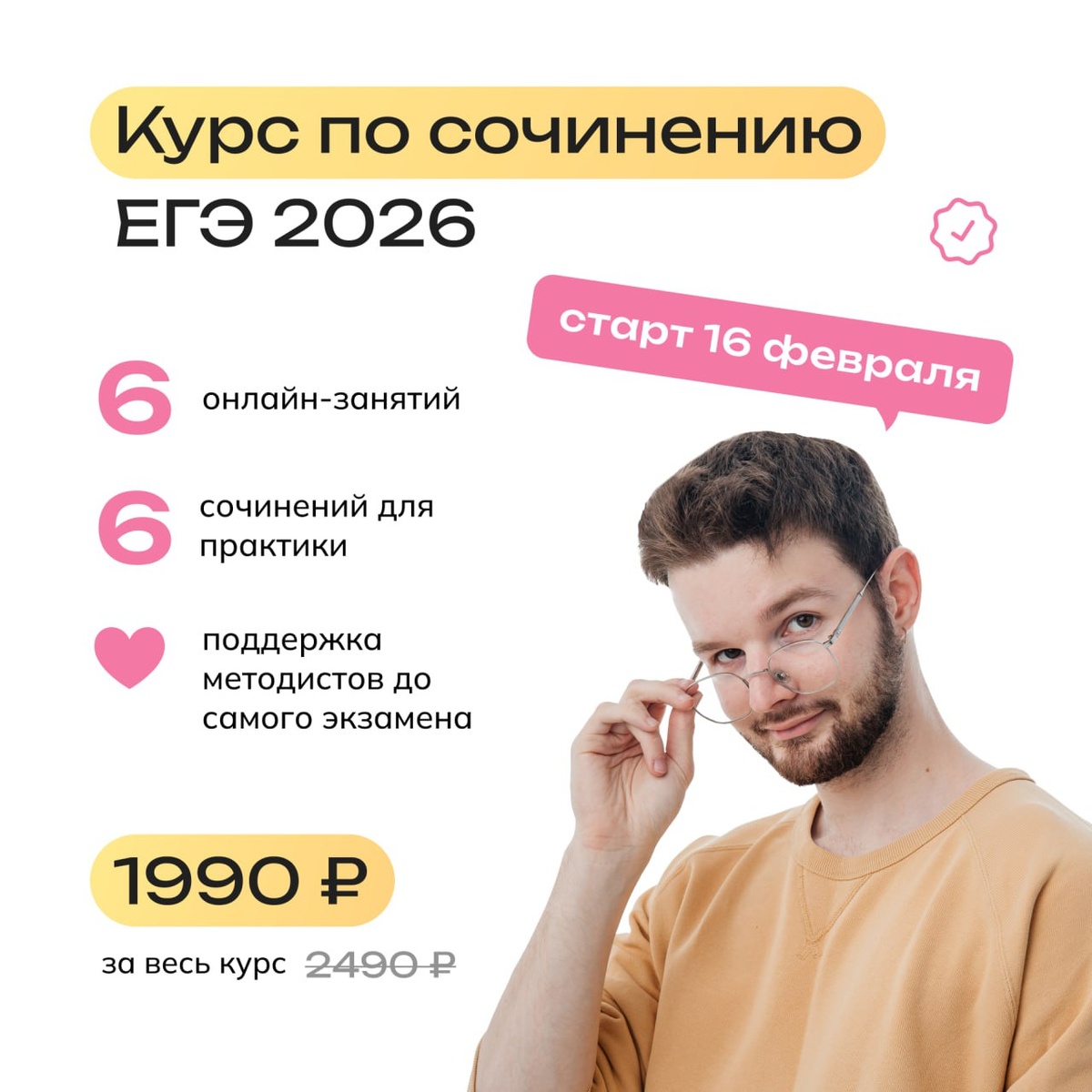 🕺 6 занятий, после которых ты – перестанешь бояться сочинения – научишься стабильно писать его на высокий балл – будешь разбираться во всех подводных камнях – серьёзно поднимешь средний балл по русскому языку ФОРМАТ КУРСА 6 онлайн-занятий с теорией и практикой. Разберём всю структуру и критерии сочинения по порядку, а на последнем уроке вместе напишем идеальное сочинение с нуля 🌙 По каждой теме также будет видеоурок и конспект РАСПИСАНИЕ Начинаем 16 февраля и встречаемся 3 раза в неделю. Всего за полмесяца ты прокачаешь сочинение на 22/22 💪 ДОМАШКИ Ты напишешь 6 полноценных сочинений в ДЗ. К каждому получишь подробную проверку и разбалловку по критериям ФИПИ, чтобы эффективно исправить ошибки МЕТОДИСТ Чат с методистом доступен до самого экзамена, можешь задавать любые вопросы туда. А также у нас в команде работает эксперт ФИПИ, который выборочно проверяет работы ЦЕНА 1990₽ за весь курс. Если хочешь прокачать не только сочинение, но и пунктуацию, при покупке 2 курсов действует