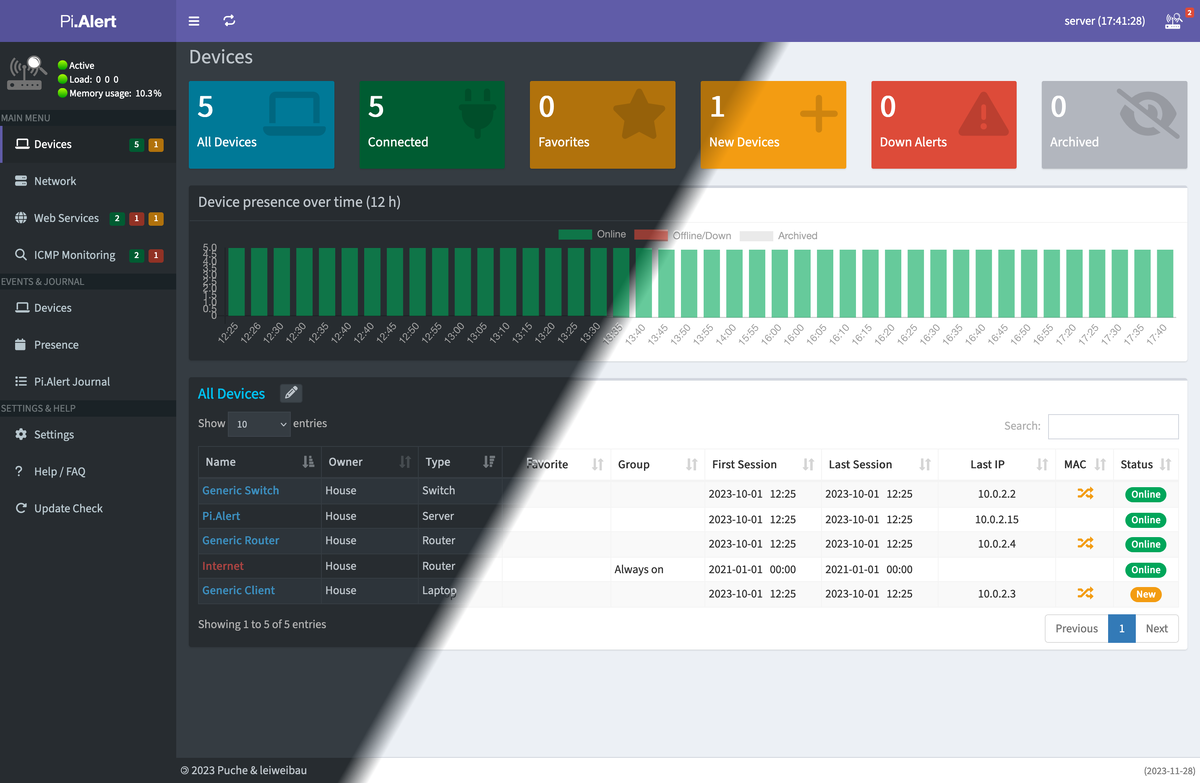 Pi.Alert — это инструмент для мониторинга локальной сети, предназначенный для обнаружения и отслеживания устройств, подключённых к Wi-Fi или проводной LAN. Он автоматически уведомляет администратора о появлении неизвестных устройств в сети, а также о пропаже тех узлов, которые должны быть постоянно доступны, что делает его удобным решением для домашнего и корпоративного использования. Pi.Alert регулярно сканирует сеть и формирует актуальный инвентарь устройств, фиксируя изменения в их состоянии. Помимо контроля подключений, инструмент способен проверять доступность веб-сервисов, анализируя HTTP-статусы и время отклика, что позволяет оперативно выявлять сбои в работе серверов и сетевых сервисов. * Сканирование сети: Обнаружение всех устройств, подключённых к Wi-Fi и LAN, с автоматическим обновлением данных. * Уведомления: Оповещение о появлении новых или неизвестных устройств, а также об отключении критически важных узлов. * Проверка веб-сервисов: Мониторинг HTTP-статусов и времени отве