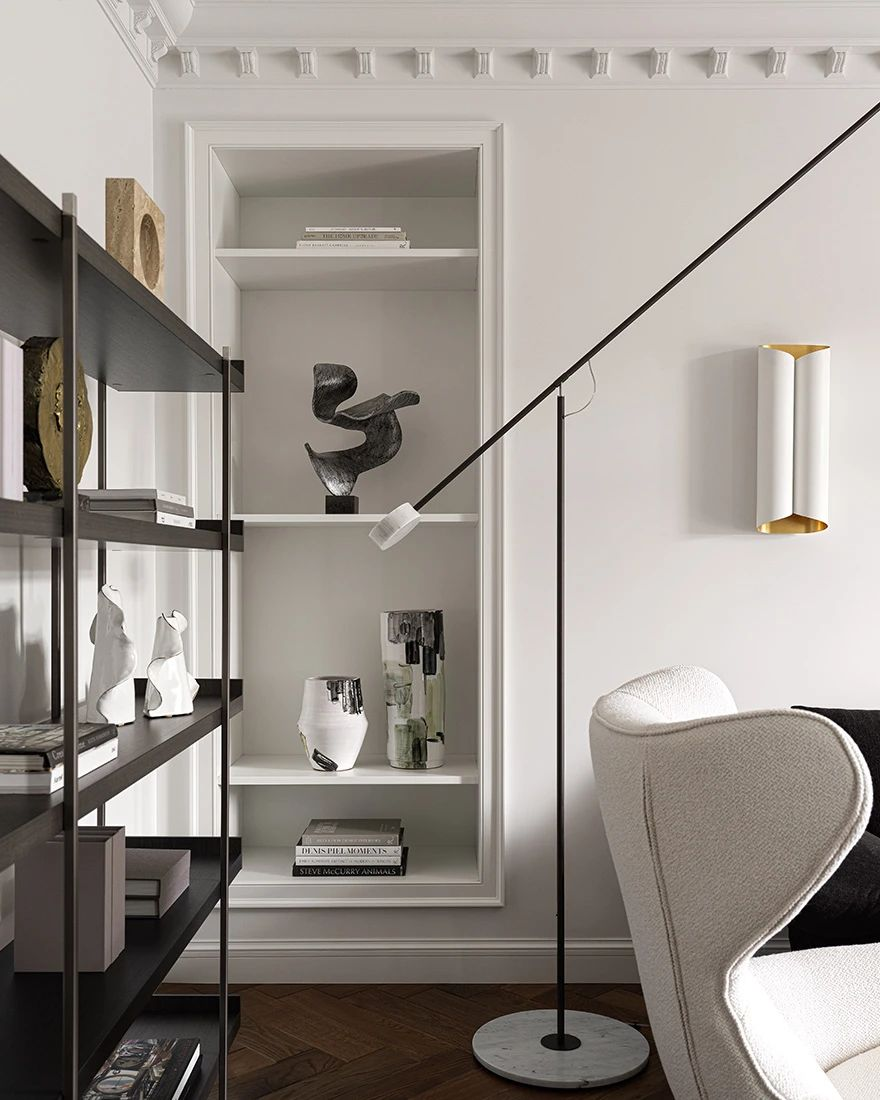 Мы делаем полки на всю глубину ниши или чуть меньше (чтобы создать игру глубины). Подсветка под полками или внутри ниши добавляет драматичность и делает предметы на полках более выразительными.