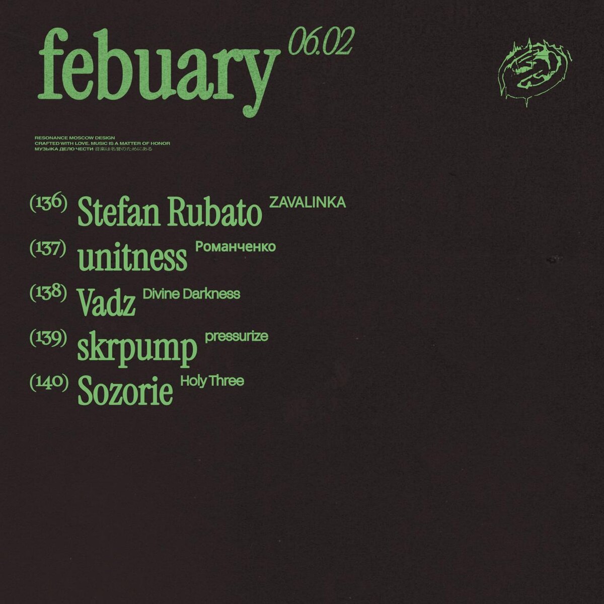 Stefan Rubato — ZAVALINKA Атмосферный электронный трек с плотным ритмом и гипнотическим развитием. Композиция построена вокруг повторяющегося мотива, постепенно раскрывающегося через изменение тембра и динамики. unitness — Романченко unitness — электронный продюсер, работающий на стыке экспериментала, лоу-фай-хауса и IDM. Фрагменты текста в его новом треке звучат внутри композиции как помехи связи. Vadz — Divine Darkness Название трека продюсера из Таганрога переводится как «священный мрак», или «божественная тьма», и отсылает к понятию всеобщего «ничто» и концепции хаоса, содержащего в себе всё и ничего одновременно. skrpump — pressurize Грув-техно трек, построенный на непрерывном нарастании давления. Плотный ритм, упругий бас и постепенно уплотняющаяся текстура создают ощущение постоянного движения вперёд без разрядки. Sozorie — Holy Three Sozorie — продюсер из Минска Николай Стешиц, который создает аккуратную агрессивную музыку. Даже самые мягкие моменты его треков строятс