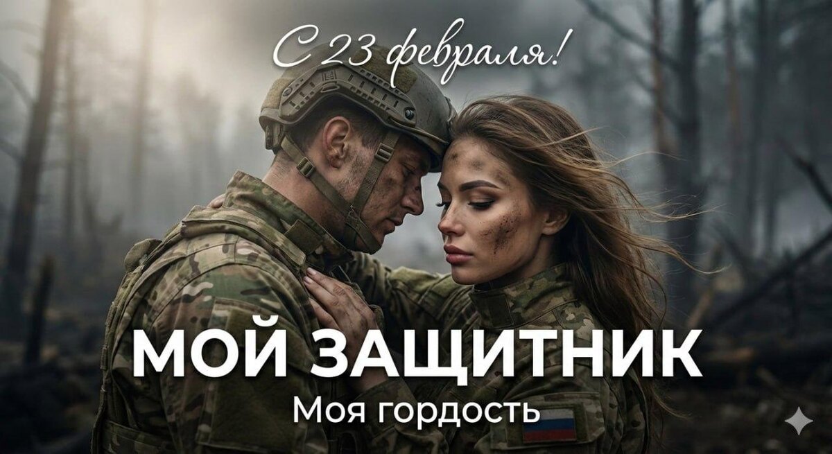 Модель: Nano Banana Сгенерировать🪄 КРИТИЧЕСКИ ВАЖНО: Точно сохранить все черты лица с загруженных фотографий - форму лица, глаза, нос, губы, брови, овал лица. Перенести внешность с фото без изменений. Создай фотореалистичный портрет пары на фоне туманного леса или разрушенного военного пейзажа. КОМПОЗИЦИЯ: Крупный план - только лица и верхняя часть фигур Пара стоит близко друг к другу, лица почти соприкасаются Интимная, эмоционально насыщенная атмосфера Момент единения и взаимной поддержки ПЕРСОНАЖИ (сохранить внешность с загруженных фото): Мужчина: в современной военной форме армии России (мультикам), в тактическом шлеме Женщина: в современной военной форме армии России (мультикам), распущенные волосы развеваются на ветру, безупречный макияж На лицах обоих заметны следы грязи и пыли Женщина смотрит вниз Мужчина слегка наклонил голову Взгляды направлены друг на друга ТЕКСТ НА ИЗОБРАЖЕНИИ: Сверху прописью: "С 23 февраля!" В центре крупными буквами: "Мой защитник" Ниже