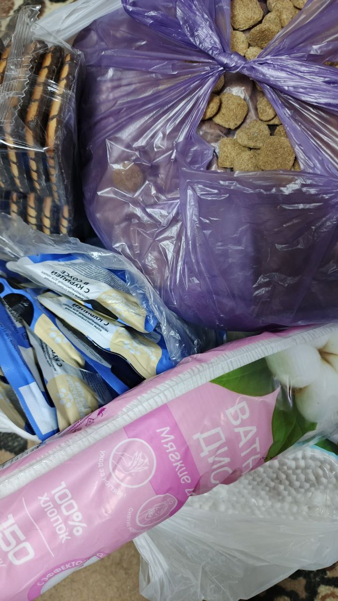 гостинцы всем- пакет сухого собакам , влажный котейкам, сопутствующие - упаковку ватных дисков и палочки ватные, а печенье нам с сыном😜🤗❤ Спасибо Вам огромное 🙏 ❤🌹