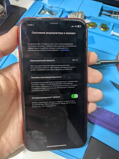Подсоедините все кабели, закройте дисплей, вкрутите винты. Включите iPhone, проверьте зарядку, сенсор, Face ID. Если батарея неоригинальная, может появиться предупреждение, но это не влияет на работу. Калибруйте: зарядите до 100% + 2 часа, разрядите до выключения, зарядите снова.