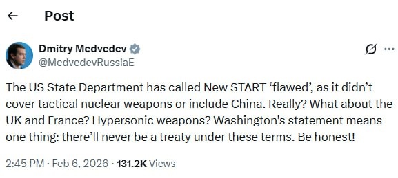: "Госдепартамент США назвал договор СНВ-3 «несовершенным», поскольку он не охватывает тактическое ядерное оружие и не включает Китай. Серьезно? А как же Великобритания и Франция? Гиперзвуковое оружие? Заявление Вашингтона означает одно: договора на таких условиях никогда не будет. Будьте честны!" — написал зампред Совбеза в соцсети Х. 🔴 Читайте Sputnik Беларусь в MAX
