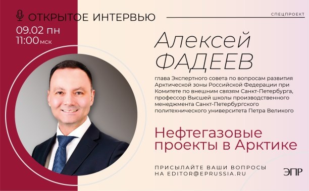 https://www.eprussia.ru/news/base/2026/392353.htm В понедельник, 9 февраля, в 11:00 (мск) состоится Открытое интервью с главой Экспертного совета по вопросам развития Арктической зоны Российской Федерации при Комитете по внешним связям Санкт-Петербурга, профессором Высшей школы производственного менеджмента Санкт-Петербургского политехнического университета Петра Великого Алексеем Фадеевым. Интервью пройдет на платформе ZOOM. Ссылка на трансляцию https://us06web.zoom.us/j/88530752093 (может послушать любой желающий). Поговорим: ✅ Об итогах и перспективах развития нефтегазовых проектов в Арктике; ✅ О задачах и проблемах импортозамещения оборудования для нефтегазодобычи и решениях, которые предлагает для этого отечественные машиностроительные предприятия. ✅ и других вопросах: кстати, ‼️ свои вопросы спикеру вы можете прислать по адресу: editor@eprussia.ru #новости_энергетики #открытое_интервью