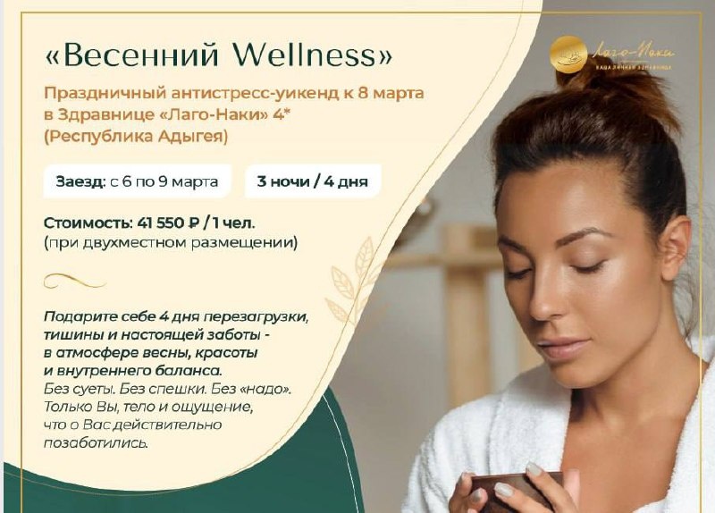 !🌷 Иногда, чтобы почувствовать весну, нужно не менять планы - а остановиться, выдохнуть и позволить себе заботу. Праздничный уикенд «Весенний Wellness» в Здравнице «Лаго-Наки» - это формат короткого, но глубокого восстановления: без спешки, без перегрузки, без компромиссов. Заезд: с 6 по 9 марта Продолжительность: 3 ночи / 4 дня Стоимость: 41 550 ₽ на 1 человека (при двухместном размещении) Что входит: - Проживание в комфортабельных номерах 4* - Трёхразовое питание в ресторане - Творческие мастер-классы - Занятия с трансформационным мастером - Утренние практики, медитации, прогулки - Музыкальный вечер для настроения и удовольствия - Пользование бассейном - Лекции и встречи с ведущими врачами Здравницы - 10 премиальных процедур глубокого расслабления: нейротренинг, профессиональные массажи, винные ванны, Широдхара, акупунктурный лифтинг и другие техники восстановления, снятия напряжения и возвращения ресурса ✨ Подарите себе 8 Марта, который останется с Вами надолго Праздничные даты