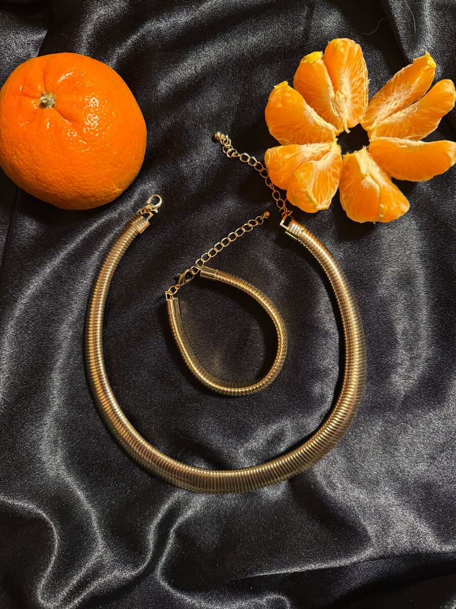 Колье и браслет от бренда “Lussovita” - настоящий набор тихой роскоши ⚜️его лаконичное исполнение идеально подчеркнет стиль, органично вписываясь в множество образов ⚜️высокое качество. У колье и браслета надежное плетение. Взяв в руки ощущаешь приятную тяжесть. Нет, от неё не устанет ни шея, ни рука. Это именно гарантия, что звенья не полые, а значит «жить» этот набор будет долго. ⚜️не окисляется при носке. Ещё один огромный плюс. ⚜️очень красивый оттенок золота. Не слишком рыжий, глубокий, с прекрасными переливами на солнце ⚜️с помощью этого набора можно идеально подчеркнуть и свою индивидуальность, и завершить образ заметными акцентами без перегруза. ⚜️дизайн изделий навеял у меня ассоциации с украшениями из эпохи Древнего Египта с примесью стиля “old money”. Шикарный подарок и себе, и любимым красоткам! Смотрится органично и с вечерними образами, и со строгим костюмом, и с игривыми лентами платьями. Как говорится: «и в пир, и в мир!» Очень удобно, что застежка позволяет регулирова