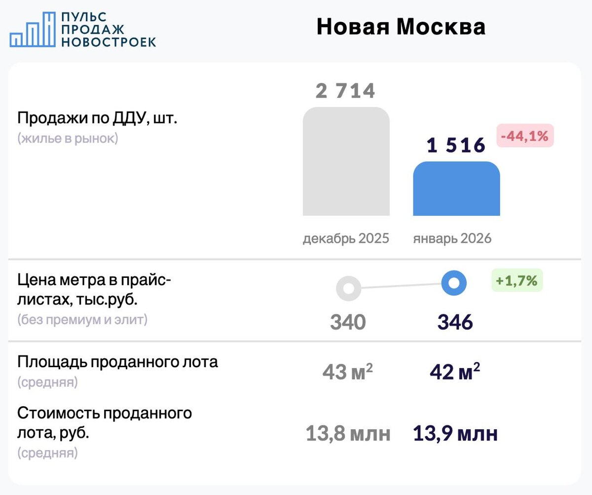 Январь 2026. Итоги продаж по ДДУ. 🏙 Сделки 1 516 сделок по ДДУ в январе 2026 (-44,1% за месяц). 💰Цены и предложение На конец января средняя цена метра составила 346 тысяч рублей (+6 000 рублей за метр, без премиум и элит сегментов). На начало февраля (на сегодня) средневзвешенная цена метра снизилась, 339 тысяч рублей. 🔸Цена метра в сделках с ДДУ выросла до 331 тысяча рублей (+13 тыс. рублей, +4,0%). Средний бюджет покупки вырос, в среднем 13,9 млн рублей за лот (+0,1 млн за месяц). Средняя площадь проданного по ДДУ лота в январе - 42 м² (-1 м² за месяц). 📈 Доля ипотечных сделок 90,0% (в декабре было 87,0%). Смотрите детальные графики, топ девелоперов и старты продаж января на нашем сайте https://pulsprodaj.ru/news/ianvar-2026-moskva-novaia/ 🔥 @pulsprodaj