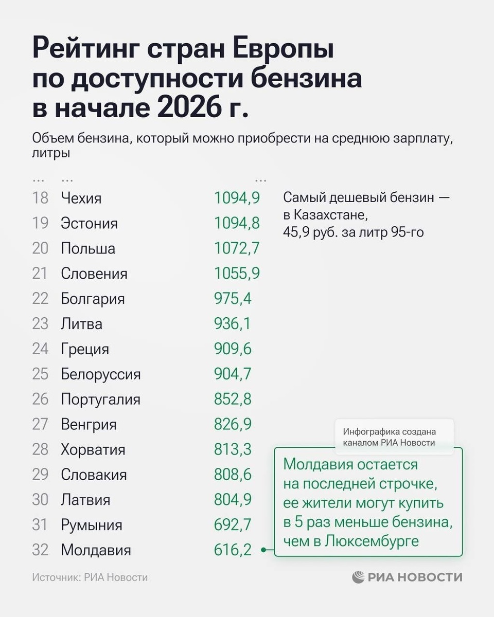 Сколько на среднюю месячную зарплату можно купить бензина? В рейтинге стран Европы по доступности бензина в начале 2026 года, составленном РИА Новости, лидируют Люксембург, Британия и Австрия. Россия расположилась на 15-й позиции – между Испанией и Италией. Ничего нового, мы примерно где-то здесь и были. Наименьшее количество топлива на свои среднемесячные зарплаты могут купить жители Молдавии, Румынии и Латвии. Украина и Турция в рейтинг не попали. Примечательно, что среди стран-лидеров заметные запасы нефти имеют лишь Норвегия и Великобритания. А самыми крупными запасами обладает, само собой, Россия. ____ 📢 Подписывайся 👉 Канал | Аварийка LIVE | ДТП и ЧП России 💬 Общайся 👉 Чат | Обсуждения и новости ДТП