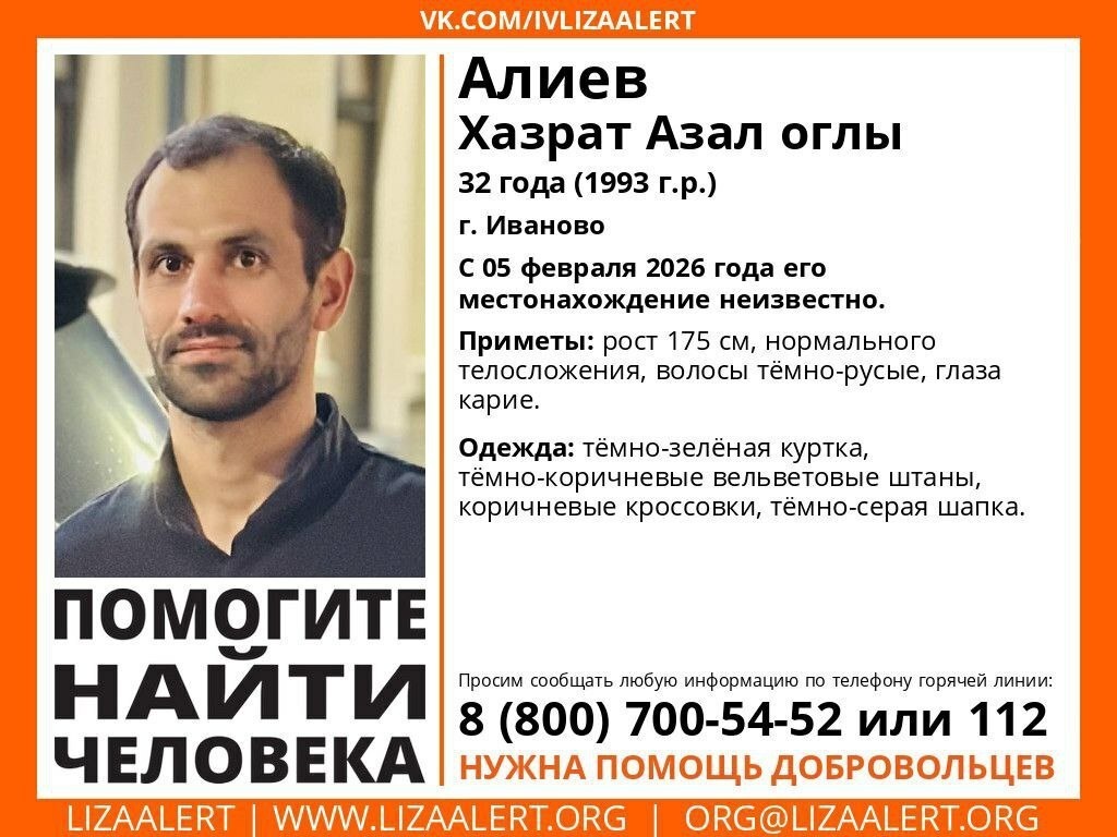 В Иванове начались поиски мужчины, пропавшего 5 февраля. 32-летнего Алиева Хазрата Азал оглы разыскивают полиция и поисково-спасательный отряд «ЛизаАлерт». Его приметы: рост около 175 см, нормального телосложения, с темно-русыми волосами и карими глазами. На нём была тёмно-зелёная куртка, тёмно-коричневые вельветовые штаны, коричневые кроссовки и тёмно-серая шапка. Любую информацию о местонахождении Хазрата Азал оглы волонтеры просят сообщать по круглосуточным телефонам: 8 (800) 700-54-52 или 112.