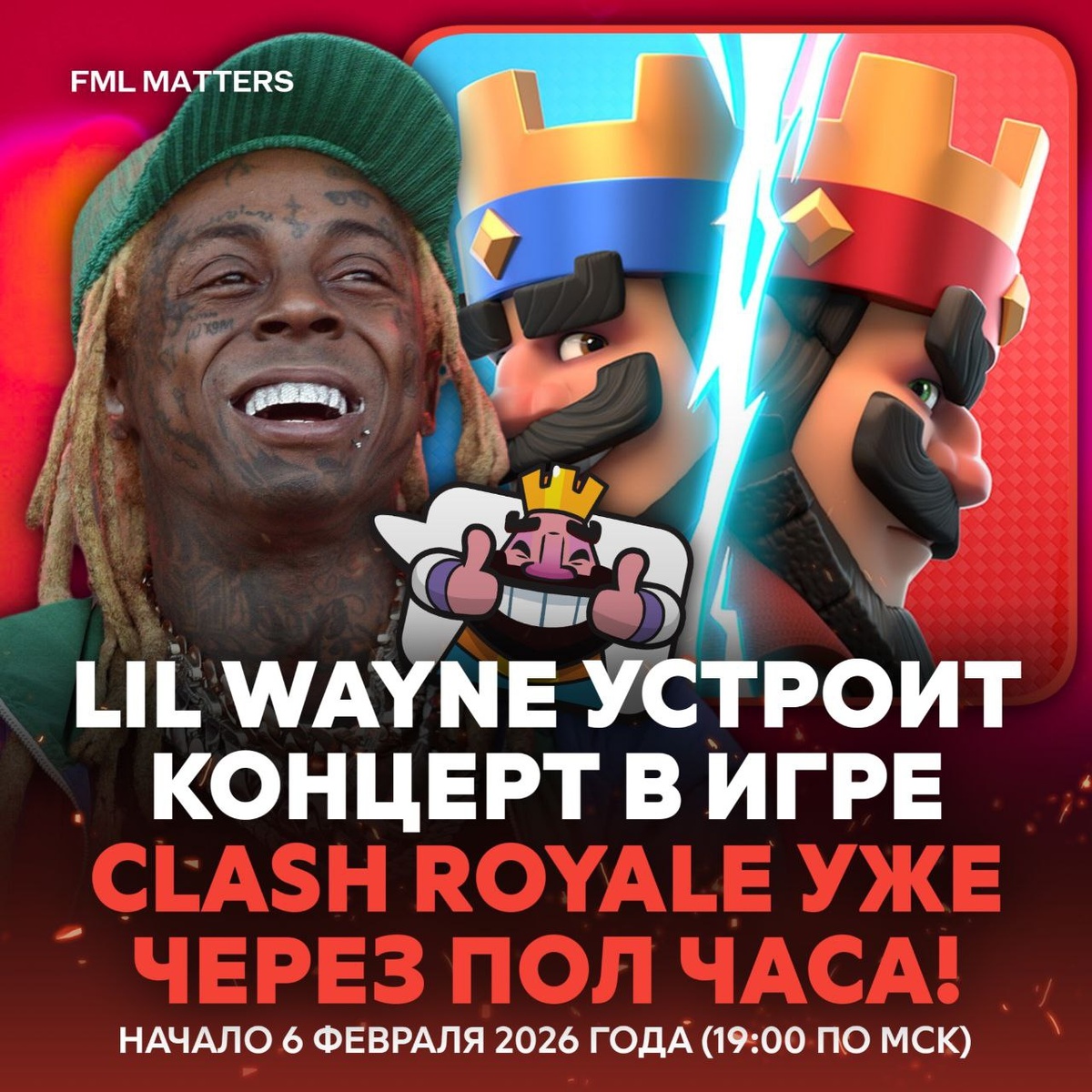 ‼️ LIL WAYNE УСТРОИТ КОНЦЕРТ В CLASH ROYALE ЧЕРЕЗ 30 МИНУТ! Рэпер проведёт виртуальное выступление в мобильной игре Clash Royale сегодня, 6 февраля, в 19:00 по московскому времени и исполнит один из своих главных хитов — «A Milli». Готовы? ❤️🔥 / 👎 💀 FML MATTERS