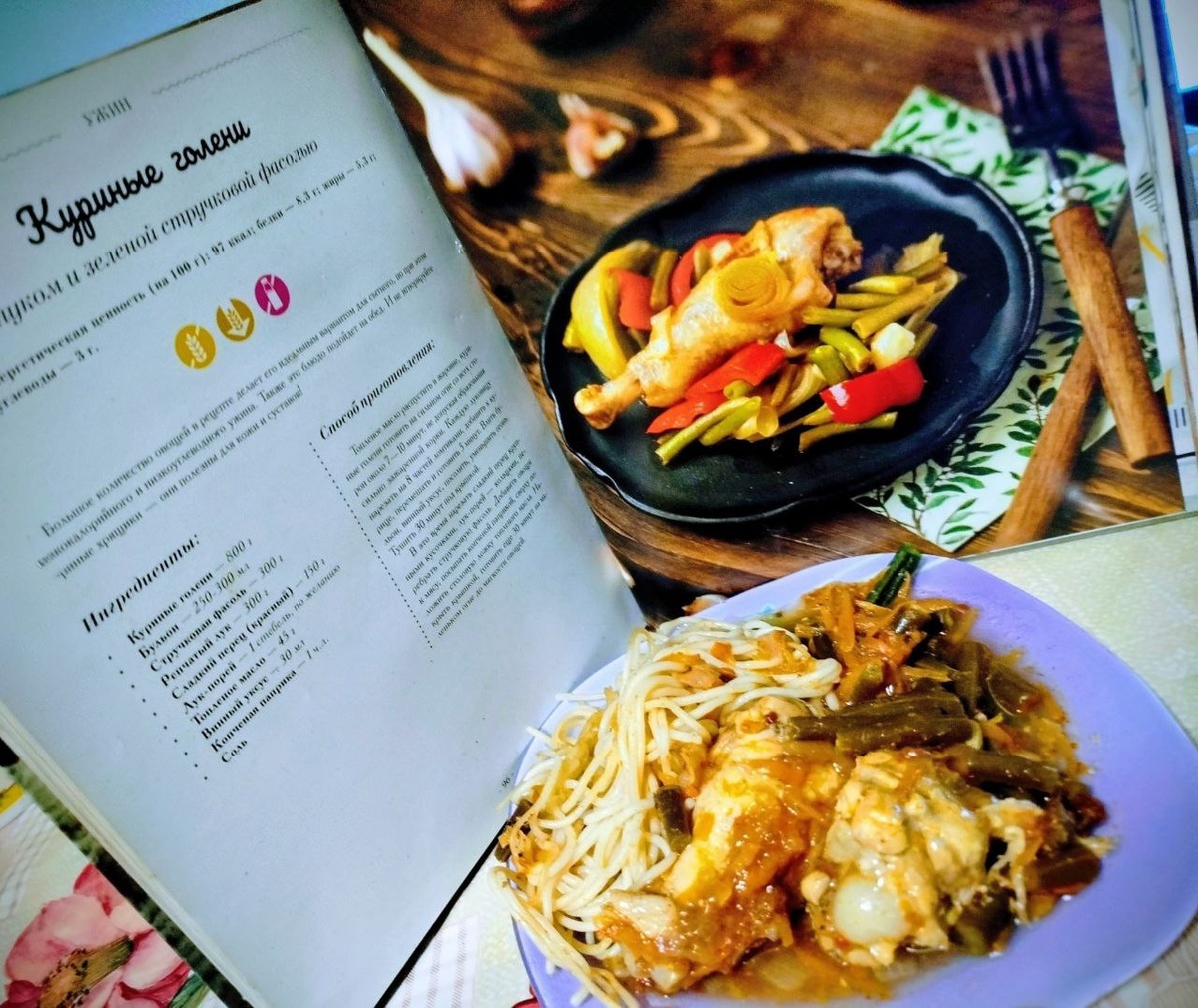 Подавай мясо, курицу, рыбу! 👌 Пару раз делала курицу с фасолью стручковой по этому рецепту, но без болгарского перца. Вместо него морковь средними брусочками. На гарнир спагетти или пюре, любая крупа - 🥣 что больше нравится! Готовим по книге "Осознанная кулинария" Д. Савельевой и Д. Третьяковой. Курицу также люблю запекать в духовке с картофельными слайсами и луком. 🧅