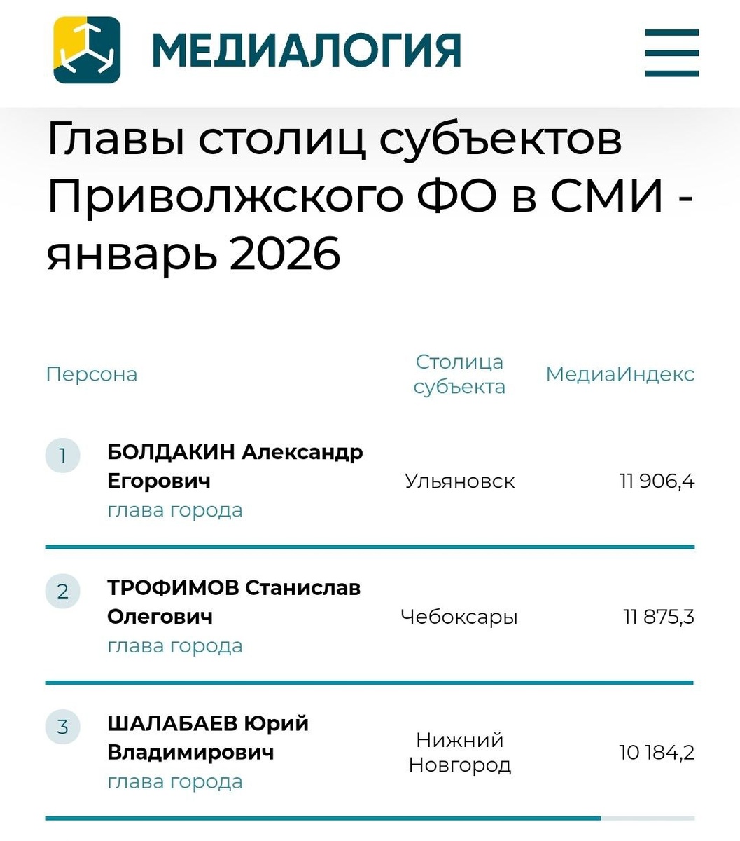 Александр Болдакин занял первое место рейтинга «Медиалогии» среди глав столиц субъектов Приволжского ФО