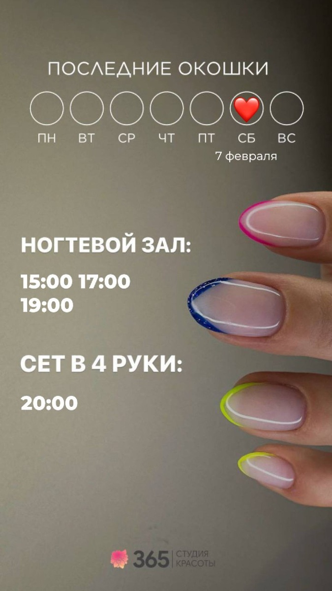 😍 Вот и наступила пятница! ❤ Впереди замечательные выходные 🍕🏠🎉 Мы рады видеть Вас в студии и приглашаем насладиться нашими услугами 🥰 Пусть ваше время у нас пройдет комфортно и приятно ❤ #красота #наслаждение #забота #зима #любовь #мечты сбываются #радость #возможности ЧТО МОЖНО УСПЕТЬ СДЕЛАТЬ 07 февраля 2026 года : Ногтевой зал: 15:00 17:00 19:00 Сет в 4 руки: 20:00 Парикмахерский зал: 10:00 20:00 Оформление бровей и ресниц: 10:00 13:00 17:00 20:00 Косметология/шугаринг: ближайшая запись на 08 февраля ЗАПИСАТЬСЯ МОЖНО ЛЮБЫМ УДОБНЫМ СПОСОБОМ: 👉🏻 Сообщение в Whats'app https://wa.me/79663654477 👉🏻По телефону +79663654477 👉🏻Онлайн запись https://n286444.yclients.com/ #команда365 #красота #наслаждение #забота #зима #январь #любовь #мечтысбываются #радость #возможности