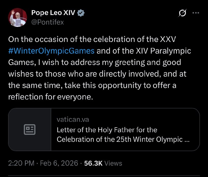 Pope Leo ‘wholeheartedly encourage all nations to rediscover and respect this instrument of hope that is the OLYMPIC Truce’